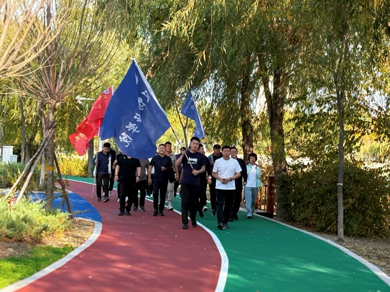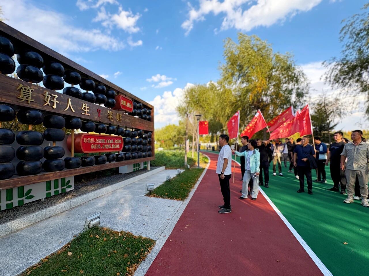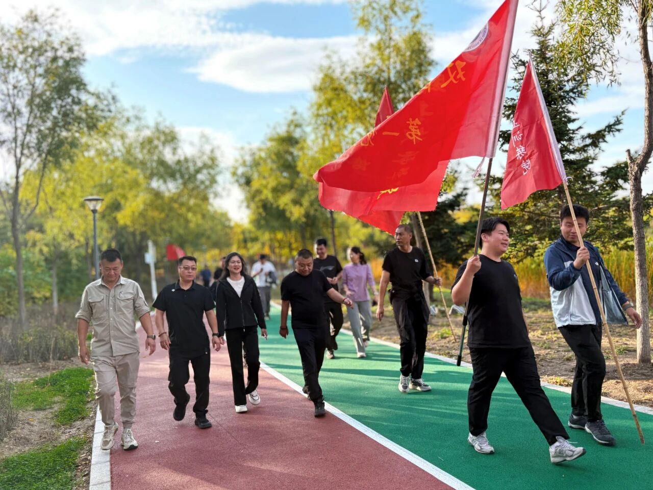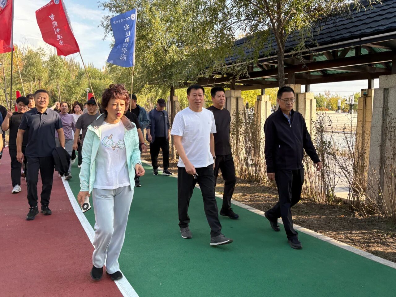 秋高气爽,阳光和煦。教职工们身着休闲运动装,精神饱满地以部门为单位在起点处有序集结。随着出发指令响起,大家迈着矫健的步伐,沿预定路线行进。途中彼此鼓励、谈笑风生,既领略了沿途的自然风光,也在轻松愉快的氛围中加深了同事情谊。行至中途的“廉洁文化园”,队伍驻足参观。教职工们认真观摩园内的廉洁主题雕塑,仔细品读廉政箴言展板,并不时交流心得体会,在沉浸式参观中进一步强化了廉洁从教、清廉修身的意识,实现了“健身”与“育廉”的有机融合。